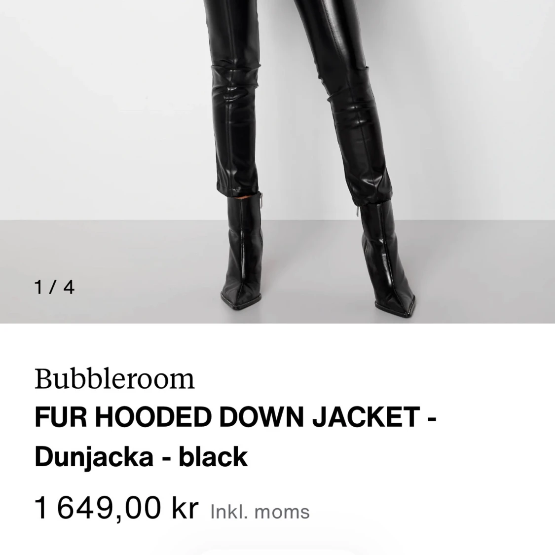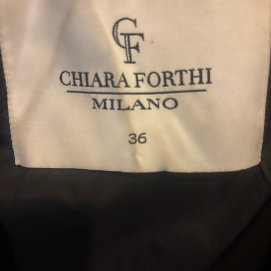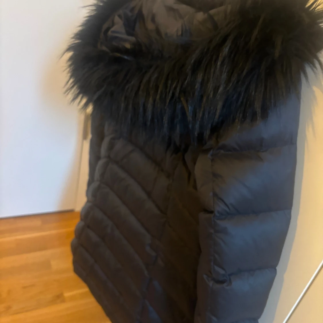 Snygg svart pufferjacka från Chiara Forthi med fluffig fuskpäls runt huvan och guldiga dragkedjor. Jackan har quiltad design, lång arm och en patch med logga på ena ärmen. Perfekt för kalla dagar när du vill vara både varm och stilren.