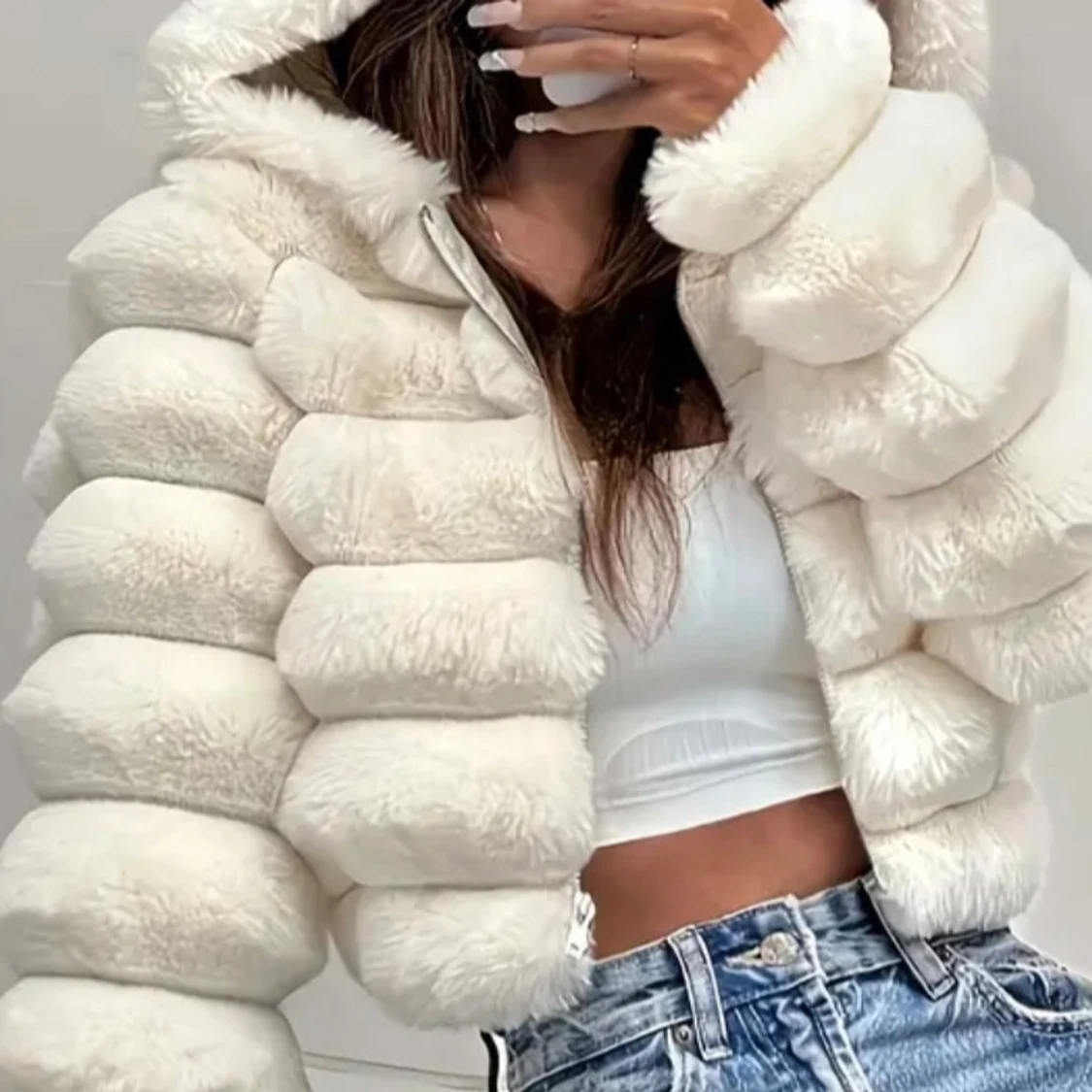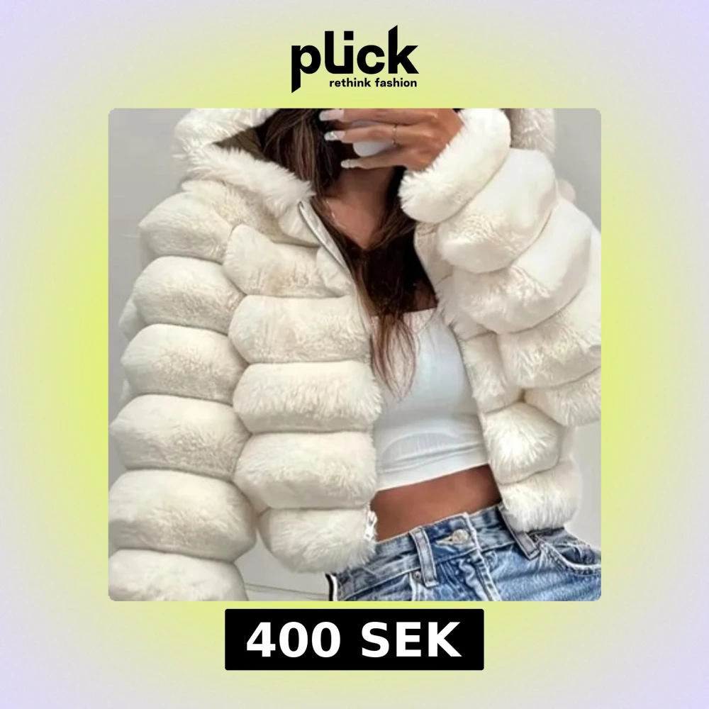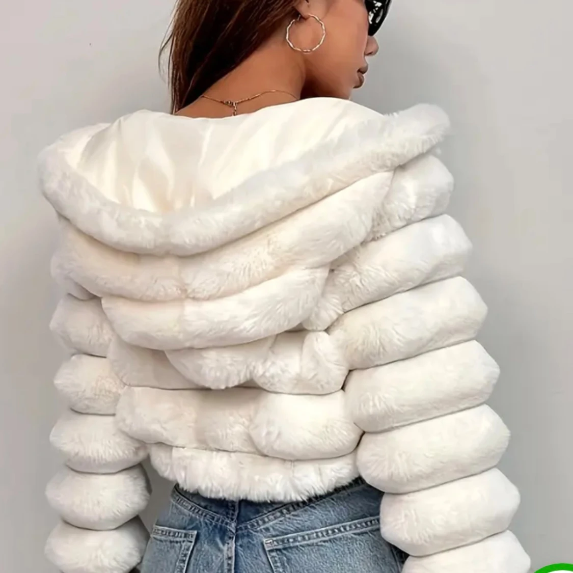 Säljer en fluffig och croppad pufferjacka i vit fuskpäls med huva. Jackan har breda, vadderade sektioner och dragkedja framtill. Perfekt för dig som vill sticka ut och hålla dig varm med stil.