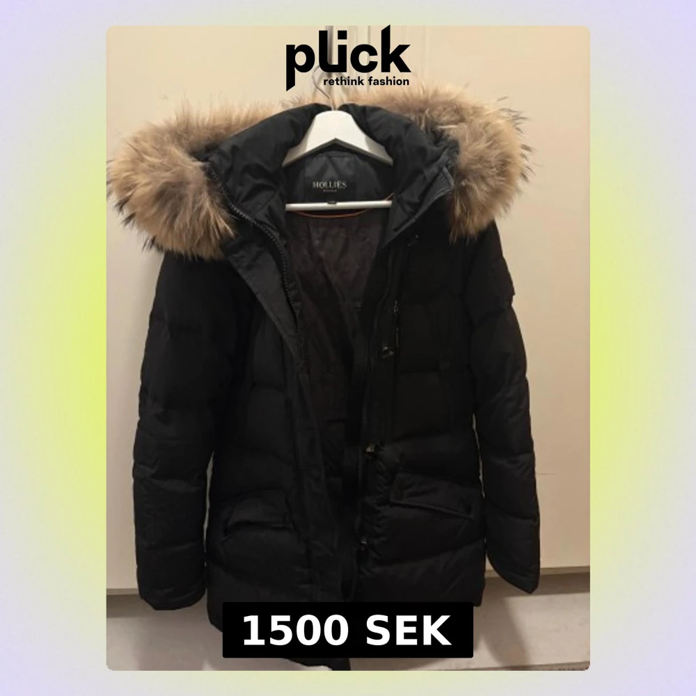 Svart dunjacka från Hollies med stor fluffig päls på huvan. Jackan har quiltad design, dragkedja och knappar framtill samt praktiska fickor. Perfekt för kalla vinterdagar och har en snygg, klassisk look med långärmade ärmar och normal passform. Den är dock sönder i jackan men när man väll har på sig den så ser man inte.