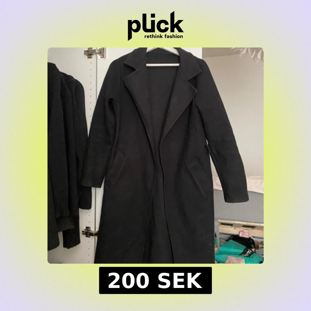Säljer en svart kappa med bred krage och långa ärmar. Jackan har två snedställda fickor framtill och en klassisk, stilren design. Perfekt för kyligare dagar och enkel att matcha med olika outfits.