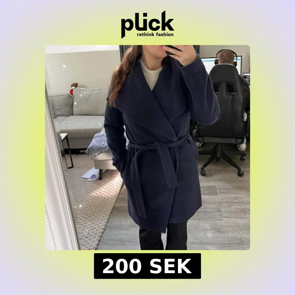 Snygg mörkblå kappa från H&M med stor, svepande krage och omlott-design. Jackan har ett elegant fall och är fodrad på insidan.