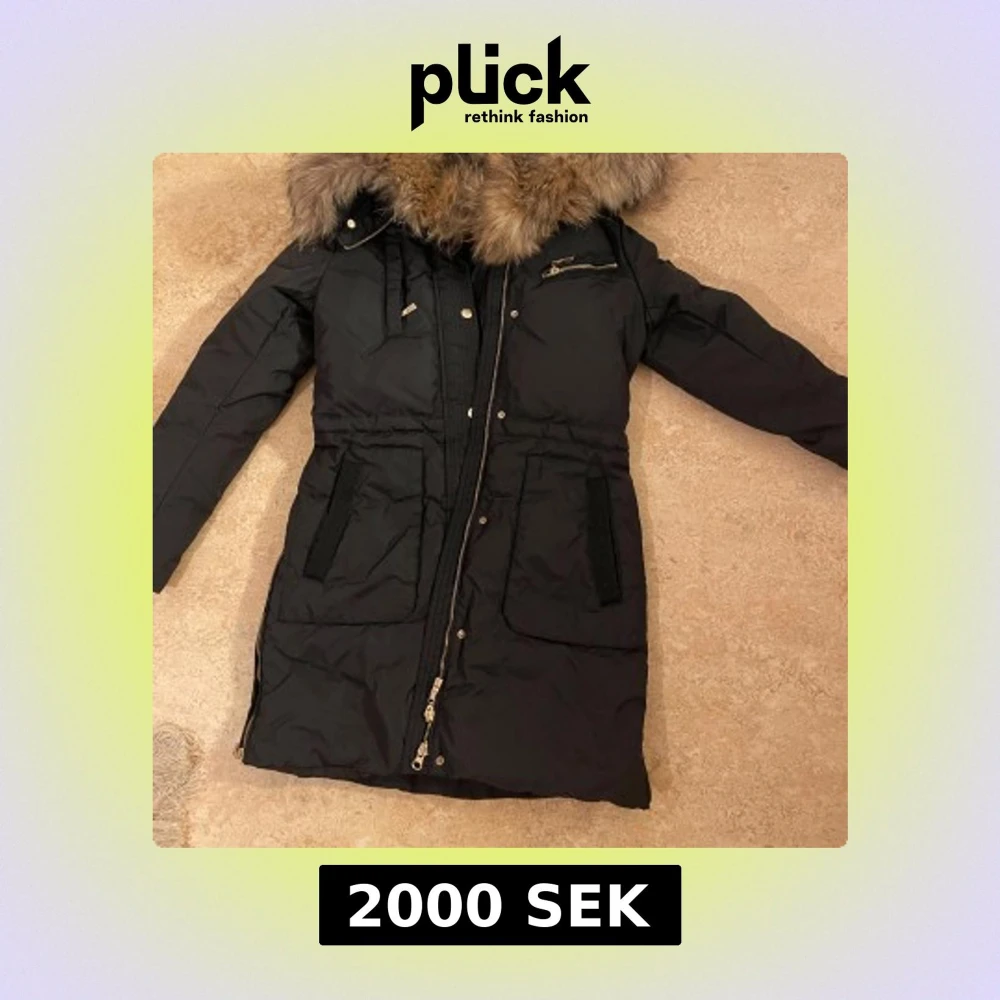 Snygg svart hollies parkajacka med avtagbar huva och pälsdetaljer. Jackan har dragkedja och knappar framtill samt flera praktiska fickor. Perfekt för kyliga dagar. Knappt använd den, säljer pga felstolek