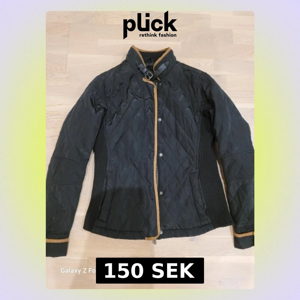 Quiltad svart jacka från Tindra med bruna detaljer längs kanterna och vid kragen. Jackan har långärmade ribbade sidor för extra komfort och en snygg spänndetalj vid halsen. Stängs med både dragkedja och knappar framtill. Perfekt för dig som gillar stilren design.