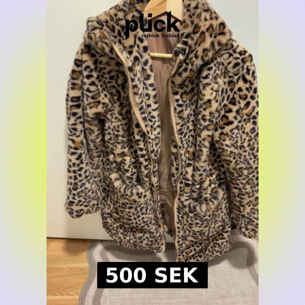 Säljer en fluffig pälsjacka med leopardmönster i beige, brunt och svart. Jackan har huva, dragkedja framtill och två fickor. Perfekt för dig som vill sticka ut och hålla dig varm under kyliga dagar.