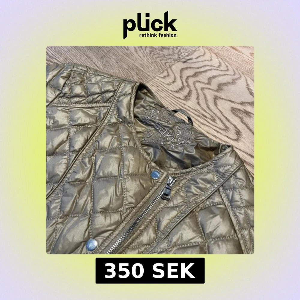Snygg quiltad jacka från Saki i beige guld nyans. Jackan har rund halsringning, dragkedja framtill, tryckknappar och två fickor med dragkedja. Materialet är glansigt och känns lätt, perfekt för övergångssäsonger.