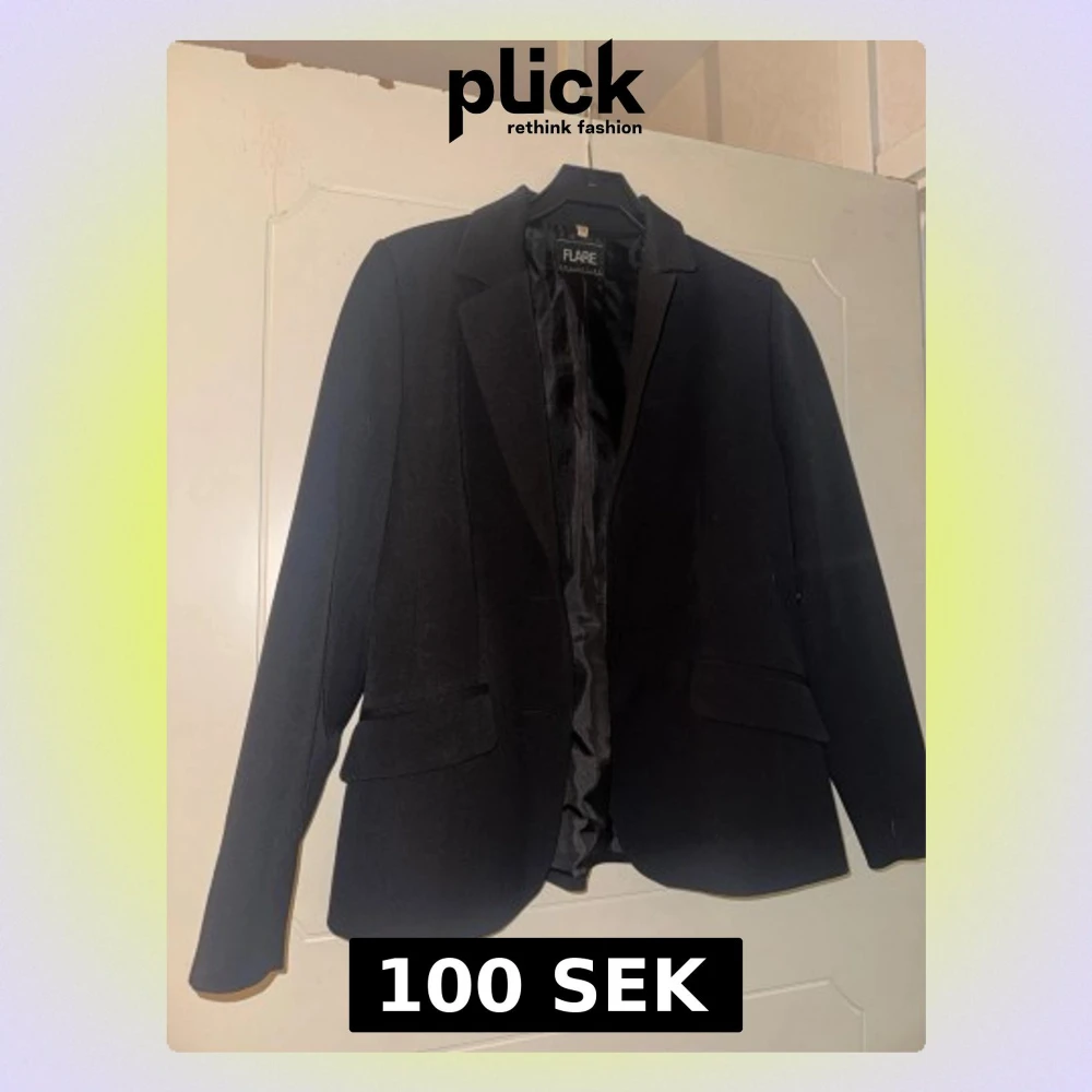 Stilren svart kavaj från Flare Collection i storlek 36. Klassisk modell med krage, två fickor med lock och helsvart foder. Perfekt för dig som vill ha en enkel och snygg kavaj till garderoben.