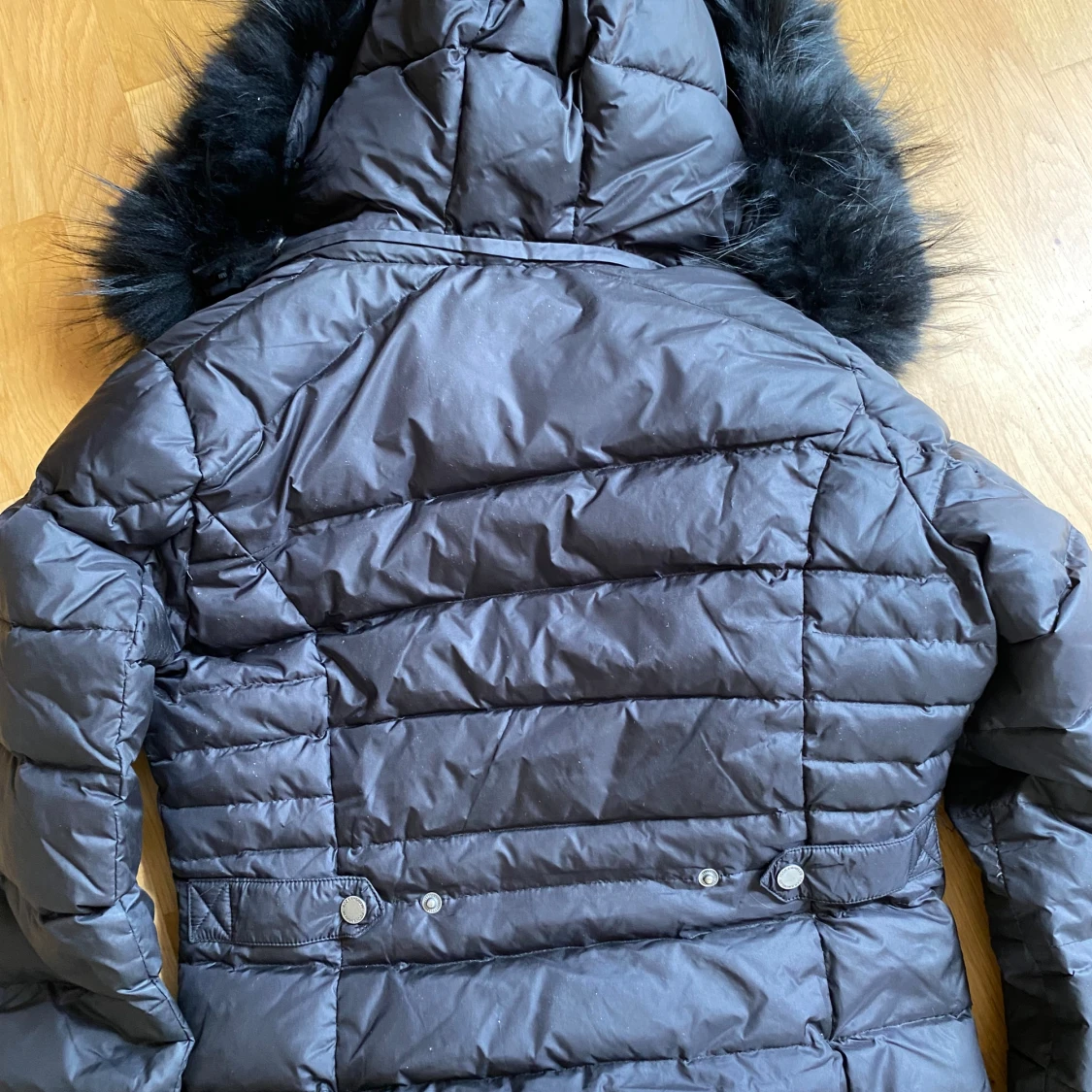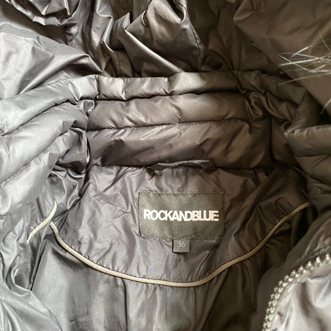 Snygg svart dunjacka från Rockandblue i storlek 36. Jackan har quiltad design, dragkedjor framtill och på fickorna samt en huva med fluffig svart fuskpäls. Perfekt för kalla dagar och riktigt stilren look.
