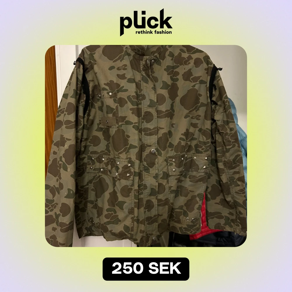 Säljer en cool camouflage jacka med nitar på fickorna. Jackan har långa ärmar och flera praktiska fickor. Perfekt för höst och vår, och ger en edgy look till din outfit. Passar bra för casual tillfällen eller när du vill sticka ut lite extra.