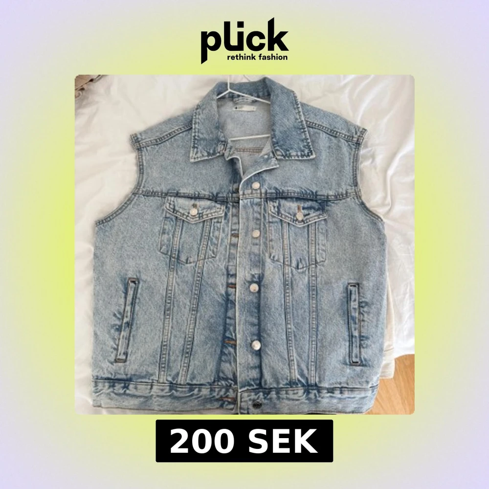 Säljer en klassisk ljusblå jeansväst med krage och silverfärgade knappar framtill. Västen har två bröstfickor med lock och knapp samt två sidofickor. Perfekt att slänga över en hoodie eller t-shirt för en cool look.