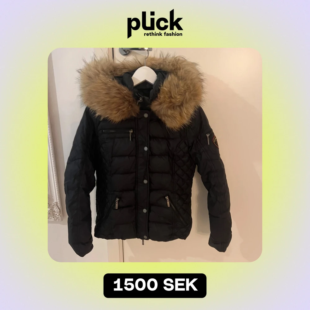 Säljer en snygg svart dunjacka från Rockandblue med en stor, mysig äkta päls på huvan. Jackan har dragkedja och knappar framtill samt flera praktiska fickor. Perfekt för kalla vinterdagar! 🖤