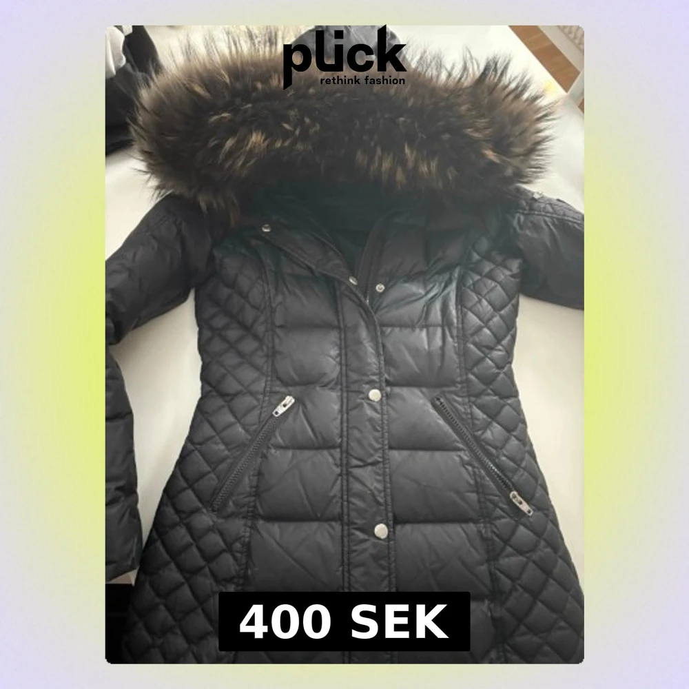 Lång svart pufferjacka med quiltat mönster och stor huva med fluffig päls. Jackan har ett hål i fodret men kan lätt lagas och påverkar inte jackans funktion och syns inte.