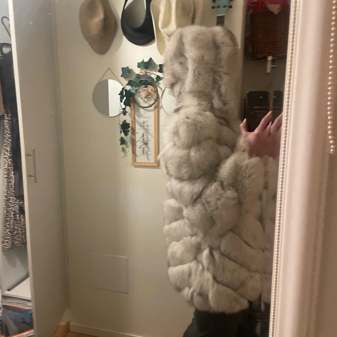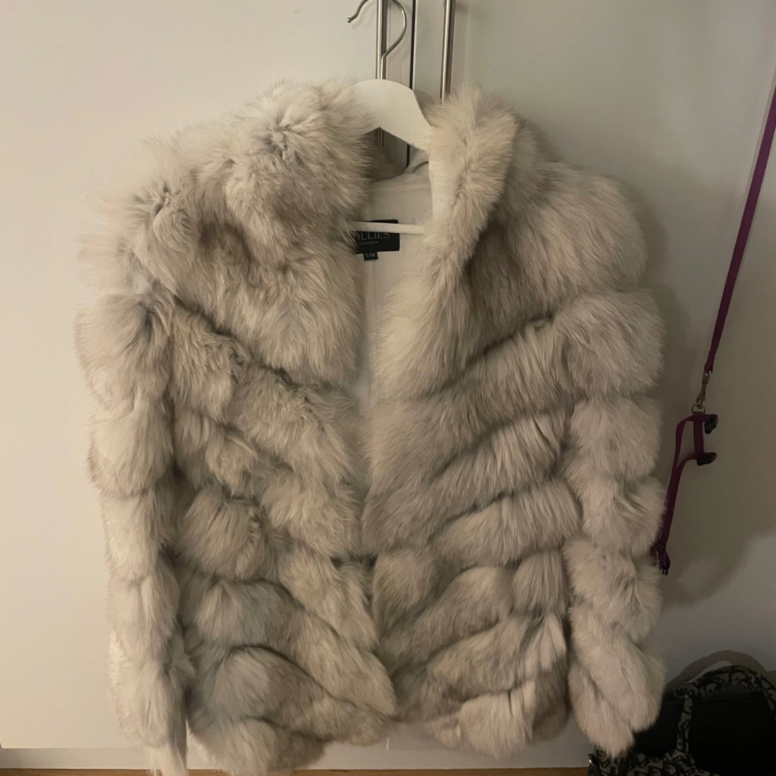 Säljer en lyxig beige pälsjacka med fluffig textur. Jackan har en elegant design och är perfekt för att hålla dig varm under kyliga dagar. Den är stilren och passar till många olika outfits.