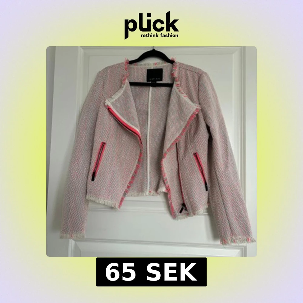 Säljer en ljusrosa kavajjacka från Amisu i vävt tyg med fransade kanter och svarta dragkedjor. Jackan har en öppen front och detaljer i rosa och vitt. Perfekt för dig som gillar en chic och trendig stil.