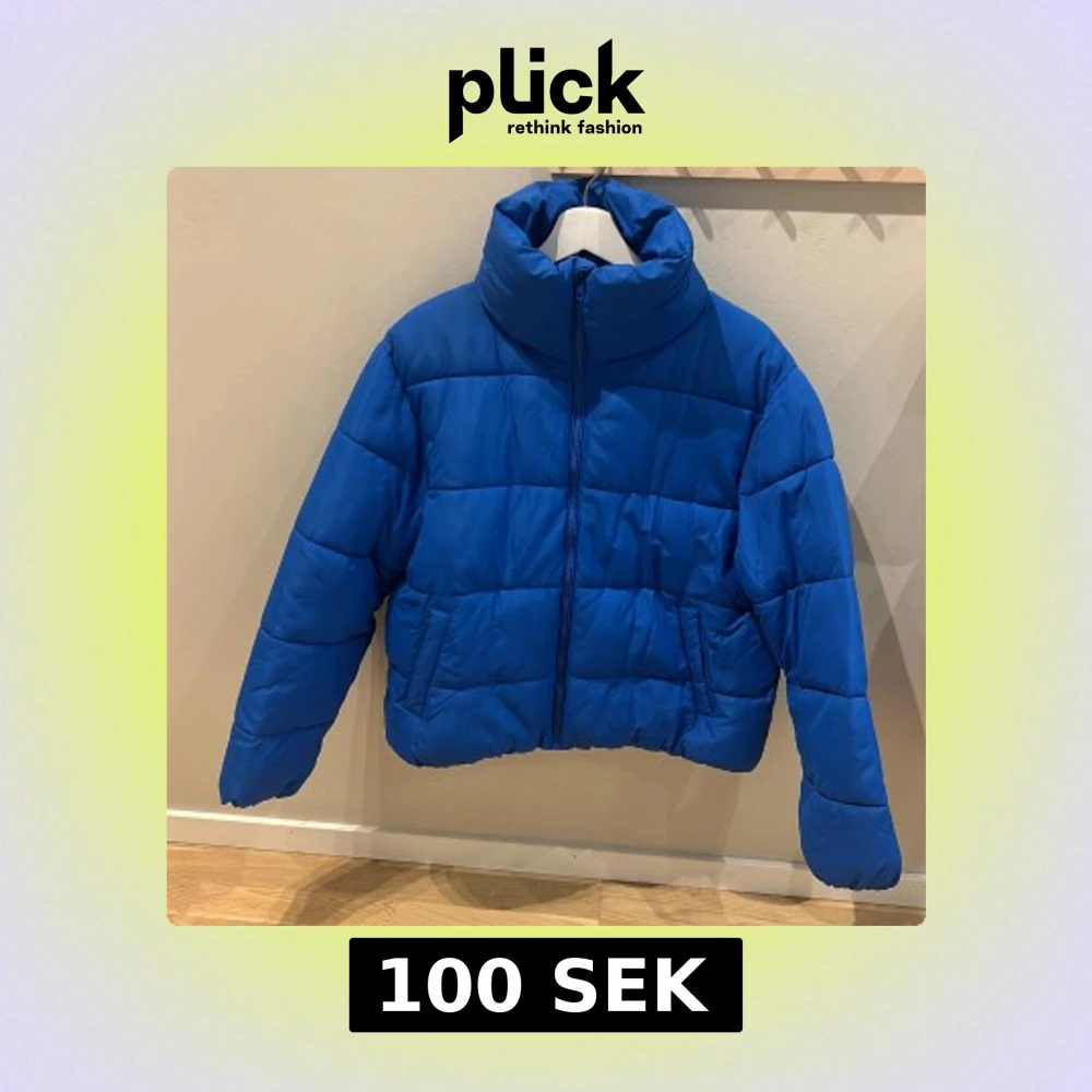 Säljer en blå pufferjacka med hög krage och dragkedja framtill. Jackan har en boxig passform och är quiltad för extra värme. Perfekt för kalla dagar och har två fickor på sidorna. Enkel och stilren design som passar till det mesta.
