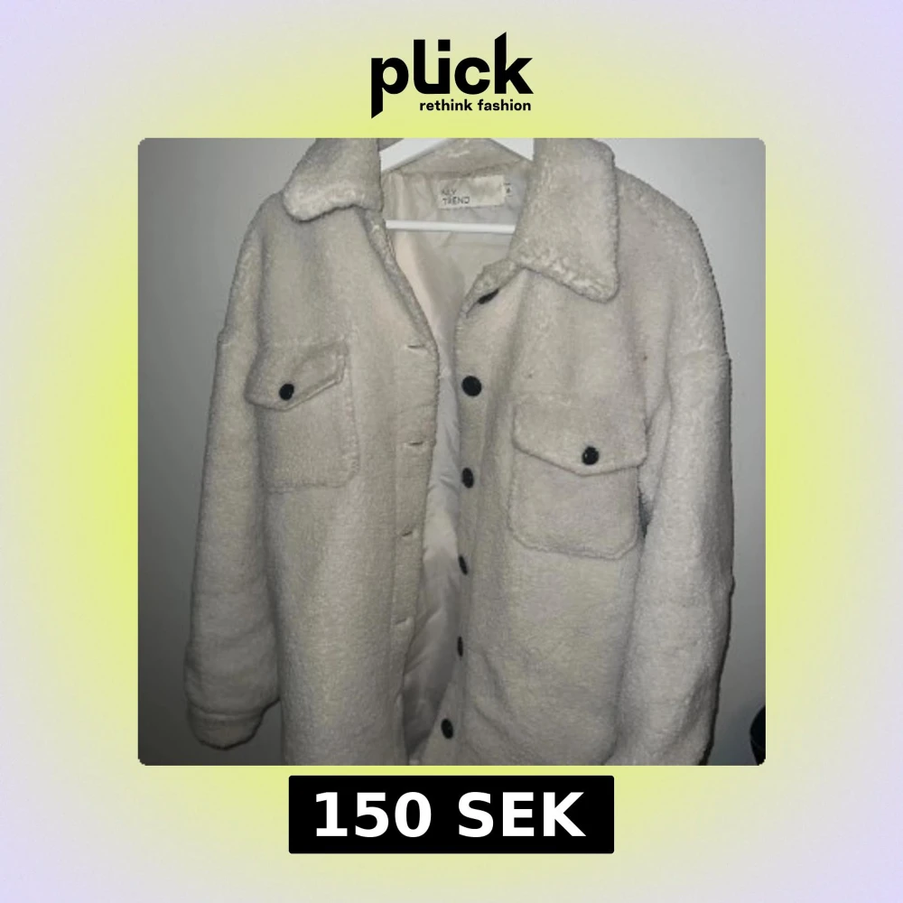 Mysig vit teddyjacka från NLY Trend med stora bröstfickor och svarta knappar framtill. Finns en fläck där bak (se bild) men går att tvätta bort.
