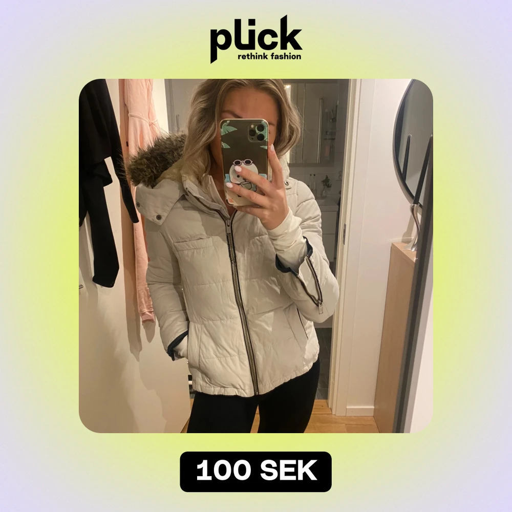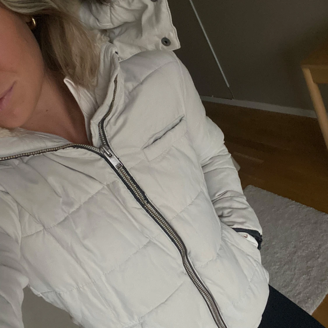 Säljer en benvit/ljusbeige pufferjacka i storlek 36. Jackan har en pälskantad huva och dragkedja framtill. Perfekt för kalla vinterdagar! 🧥❄️