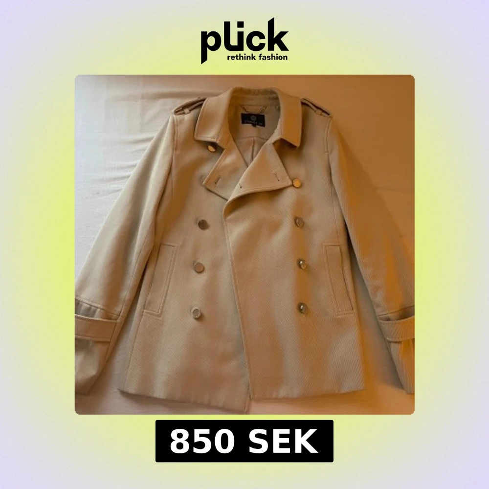 Säljer en stilren beige kappa från STOCKH LM med dubbelknäppning och axelklaffar. Jackan har långa ärmar, klassisk krage och dekorativa knappar med märkets logga. Perfekt för dig som gillar en tidlös look.