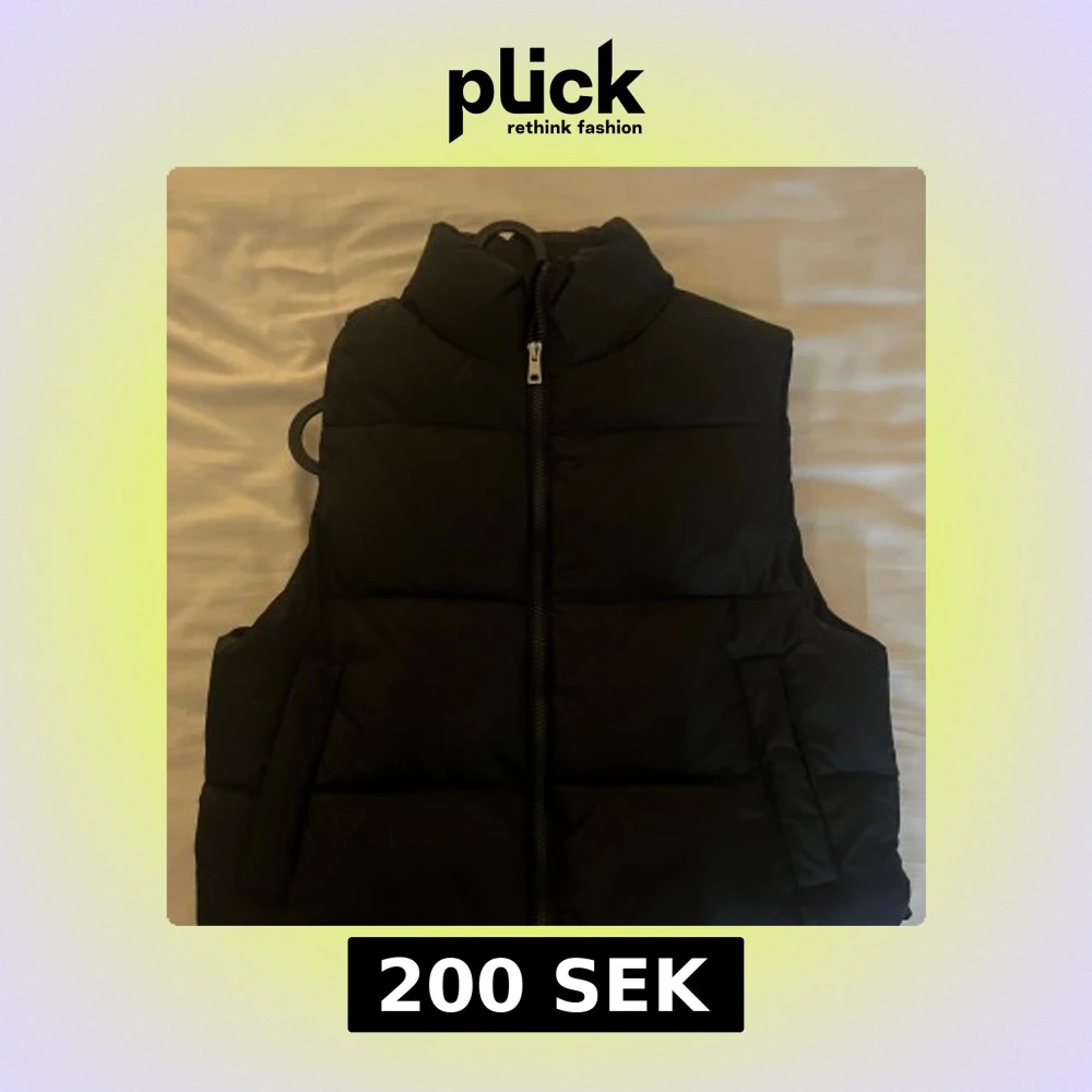 Säljer en svart dunväst med hög krage och dragkedja framtill. Västen har två fickor på sidorna och är quiltad för extra värme. Perfekt att slänga över en hoodie eller tröja när det är kyligt ute.