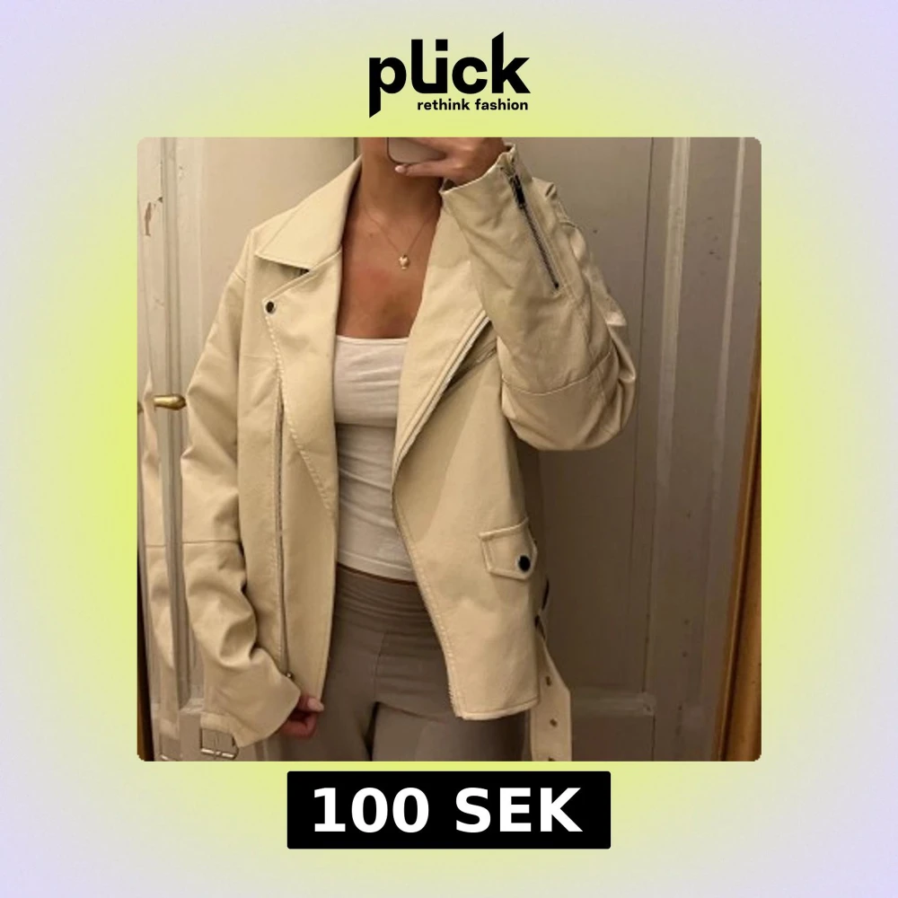 Snygg beige skinnjacka från NLY Trend med coola detaljer som dragkedjor, knappar och bälte i midjan. Jackan har en loose passform och klassisk krage, perfekt för dig som vill ha en stilren look med edge. Storlek 36.