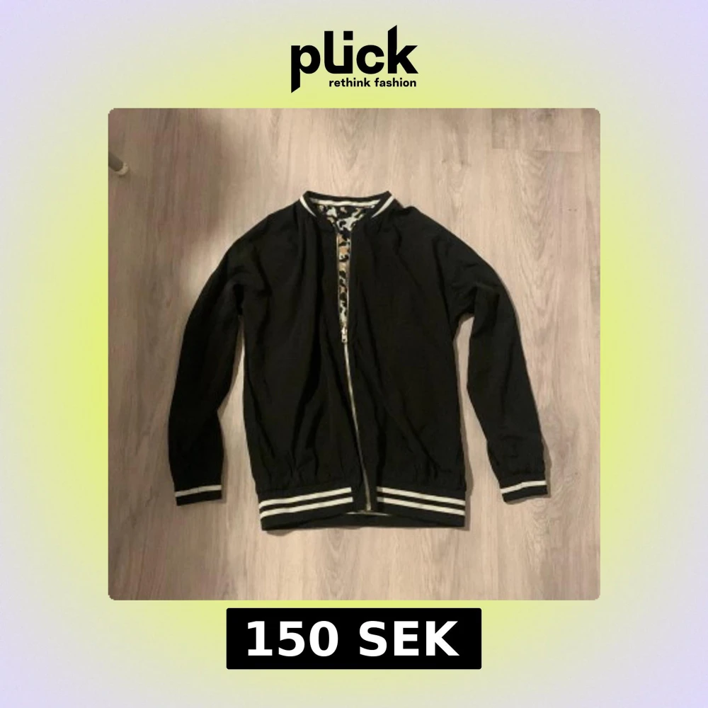Snygg bomberjacka med leopardmönster i svart, beige och brunt. Jackan har svarta muddar med vita ränder vid ärmslut och midja samt hel dragkedja framtill. Insidan är svart, vilket gör den vändbar för två olika looks. Perfekt för dig som vill sticka ut.