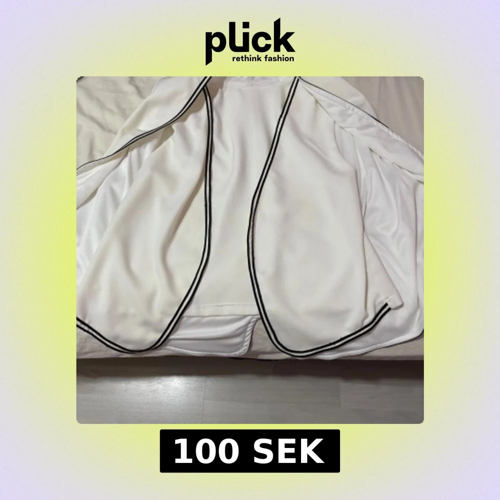 Elegant vit kappa med svarta kantdetaljer. Perfekt för en stilren look. Den har en öppen design utan knappar eller dragkedja.