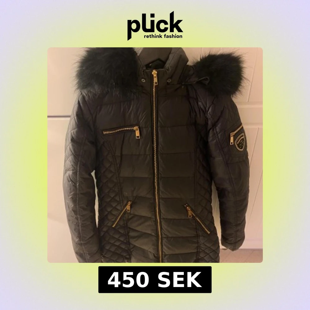 Snygg svart dunjacka från Rockandblue med quiltade detaljer, guldiga dragkedjor och stor huva med fluffig fuskpäls. Jackan har flera fickor med dragkedja och en patch på ärmen. Perfekt för kalla dagar när du vill vara både varm och stilren. Lite defekter så som hål i ficka och små små hål vi ärmen som syns på bild.