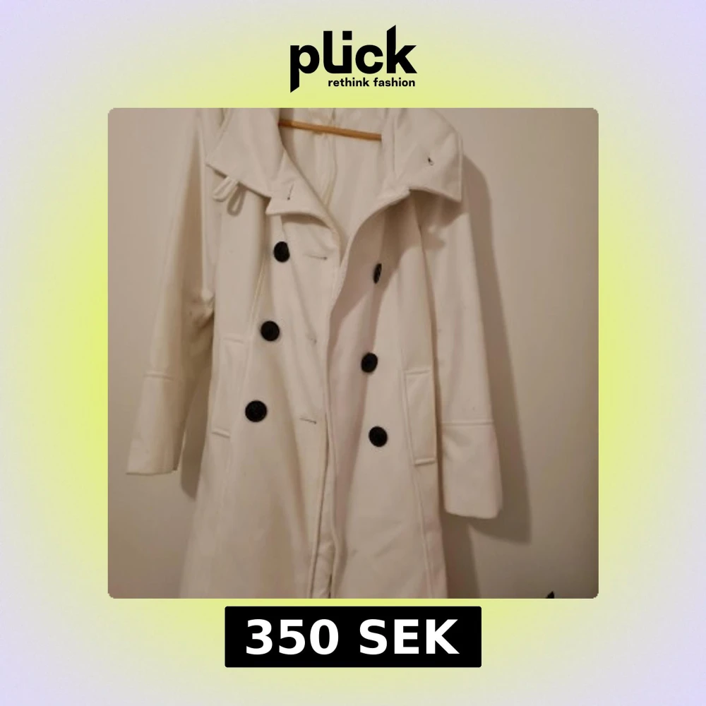 Elegant vit kappa med stora svarta knappar och bälte i midjan. Perfekt för kyliga dagar med sin långa design och stilrena look. Kappan har långa ärmar och en klassisk krage.