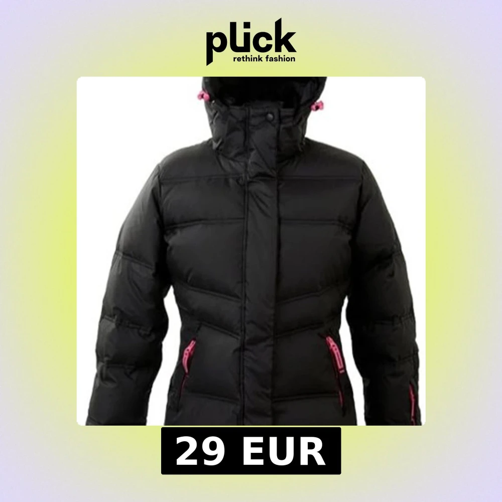 Säljer en svart dunjacka från Twentyfour med rosa dragkedjor och broderad logga. Jackan har en hög krage och långa ärmar, perfekt för kalla dagar. Den är designad i Norge och har en stilren look.