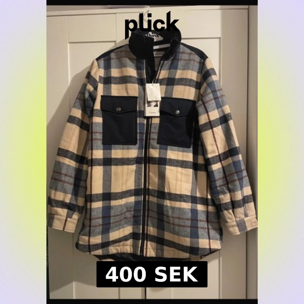 Snygg overshirt jacka från Fransa med rutigt mönster i beige, blått och mörkblå detaljer. Jackan har två stora bröstfickor med knappar, dragkedja framtill och hög krage. Perfekt för lager-på-lager och chill stil.