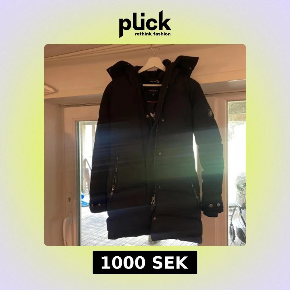 Säljer en svart lång dunjacka från Hollies i storlek 36. Jackan har huva, två dragkedjefickor och snygga detaljer med knappar vid ärmslut. Perfekt för kalla dagar och har en stilren look som funkar till det mesta.