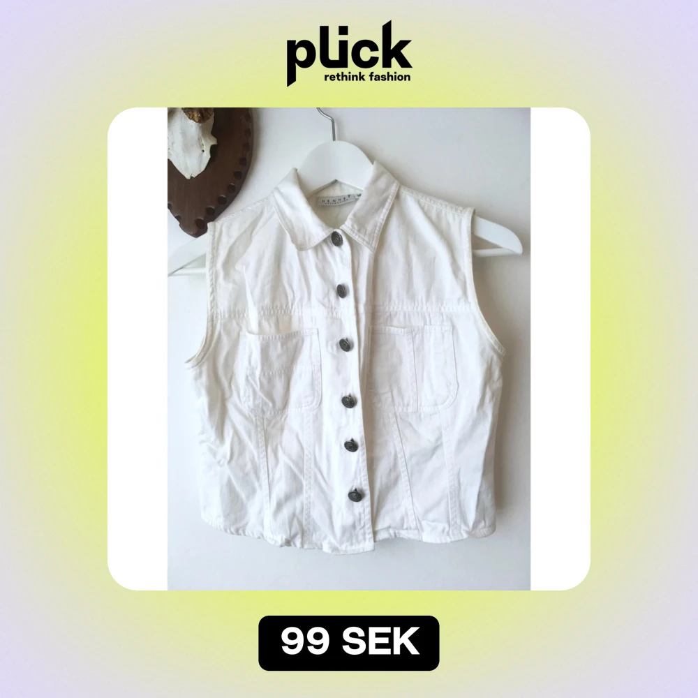 Vit väst i tunnare denim, figurnära kort modell. Lätt gulnad på insidan av nacken. Storlek (EU): 36 (något liten, passar XS/S), Bröstvidd: 43 cm, Axelbredd: 32 cm, Längd fram från axeln: 43 cm