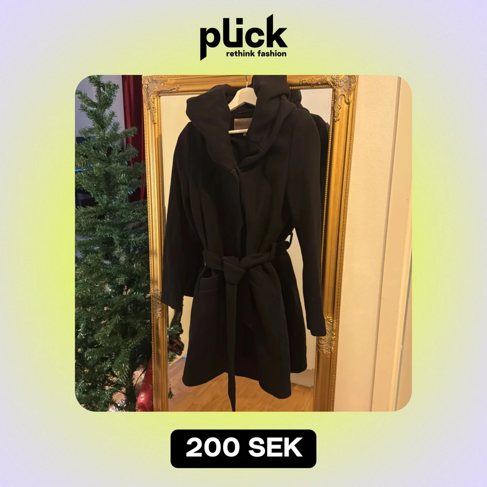 Säljer en elegant svart kappa med huva och knytskärp i midjan. Perfekt för höst och vinter. Den har långa ärmar och en stilren design som passar både till vardags och fest.