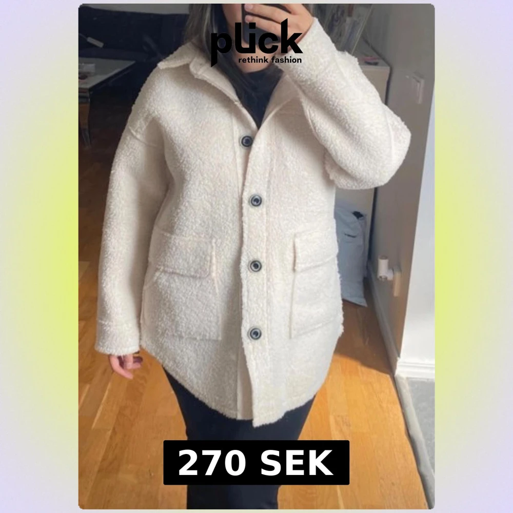 Supermjuk vit teddyjacka med stora knappar och två rejäla fickor framtill. Jackan har klassisk krage och lång ärm, perfekt för lager-på-lager. Materialet är fluffigt och ger en riktigt cozy vibe. Helt ny