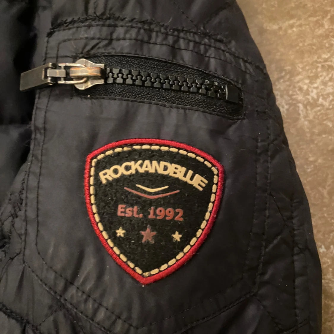 Säljer en svart dunjacka från Rockandblue med snygg pälsdetalj på huvan. Jackan har flera praktiska dragkedjor och en cool patch på ärmen. Perfekt för kalla vinterdagar! den har ett litet hål på armen men den syns knappt.