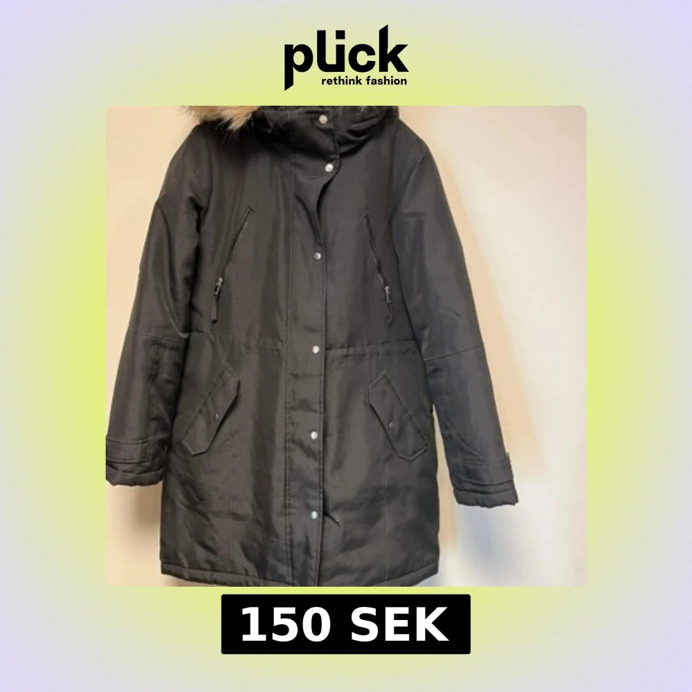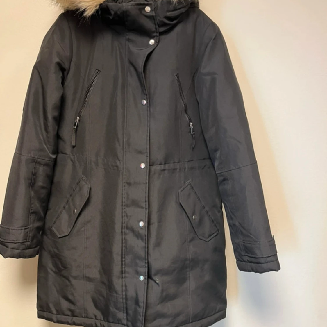 Svart parkajacka med huva och fuskpälsdetalj. Jackan har dragkedja och knappar framtill, två snedställda bröstfickor med dragkedja och två stora fickor med lock. Perfekt för kalla dagar och riktigt snygg stil.