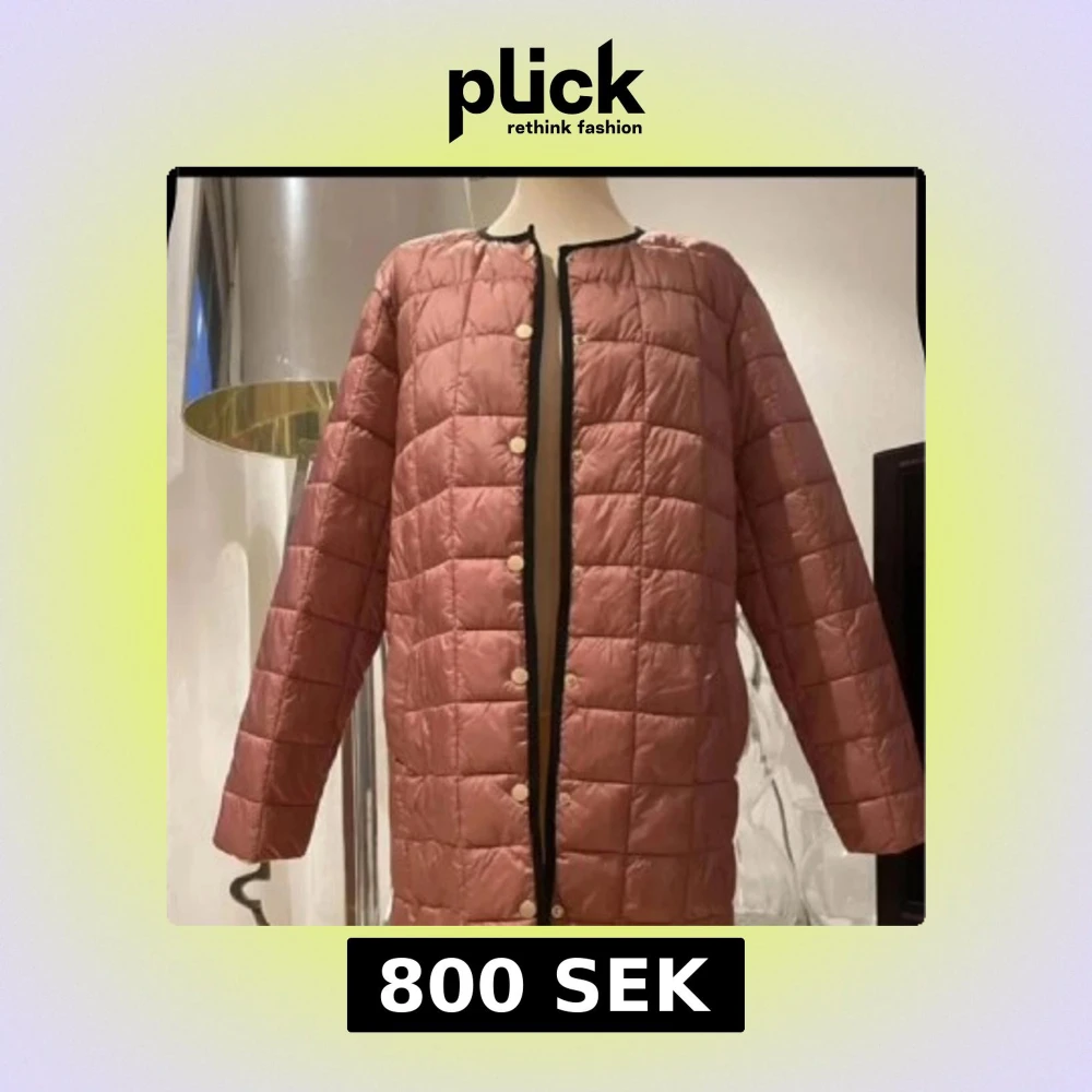 Lång, quiltad pufferjacka i matt rosa med svarta detaljer längs kanterna. Jackan har rund halsringning, tryckknappar framtill och raka ärmar. Den är lätt vadderad och har en stilren, minimalistisk look som passar perfekt till kyliga dagar.
