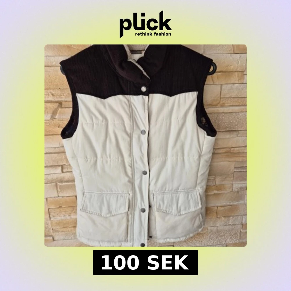 Snygg dunväst från Tindra i vit och mörkbrun färg med manchesterdetaljer upptill. Västen har tryckknappar framtill, två stora fickor och ett rutigt innerfoder med dragkedja. Perfekt för lager-på-lager och chill stil. Aldrig använd.