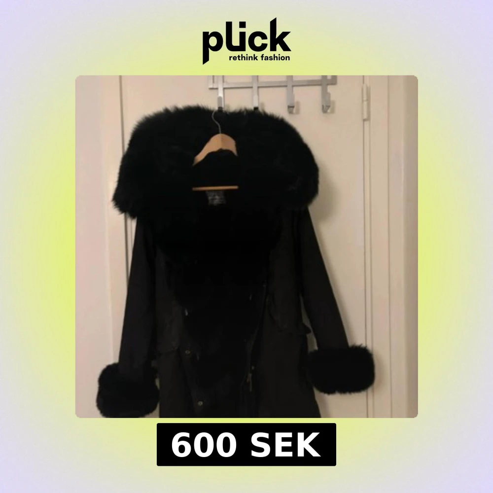 Säljer en svart pälsjacka med stor fluffig krage och breda pälskanter vid ärmsluten. Jackan har en klassisk och lyxig vibe, perfekt för kalla dagar när du vill sticka ut. Stängs med knappar framtill och har en snygg siluett.