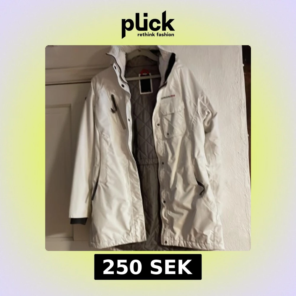 Säljer en stilren vit parkajacka från Didriksons med quiltat foder och praktiska fickor. Jackan har en hög krage och justerbar huva, perfekt för kyliga dagar. Den har både dragkedja och knappar framtill för extra skydd mot väder och vind.