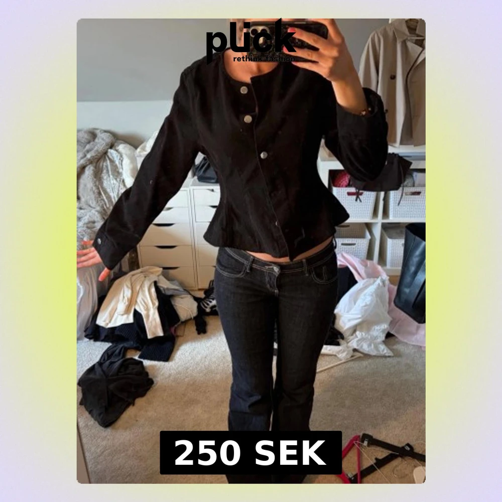 Säljer en svart figursydd jacka med rund halsringning och stora silvriga knappar framtill. Jackan har lång ärm och lätt utsvängd midja för en snygg siluett. Perfekt till jeans eller kjol för en clean look.