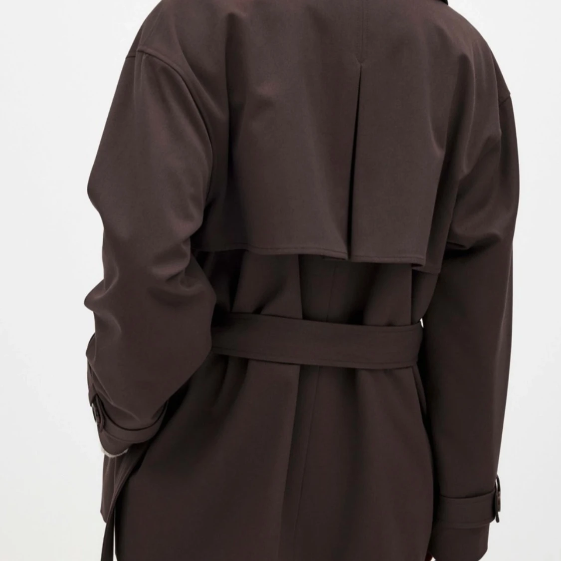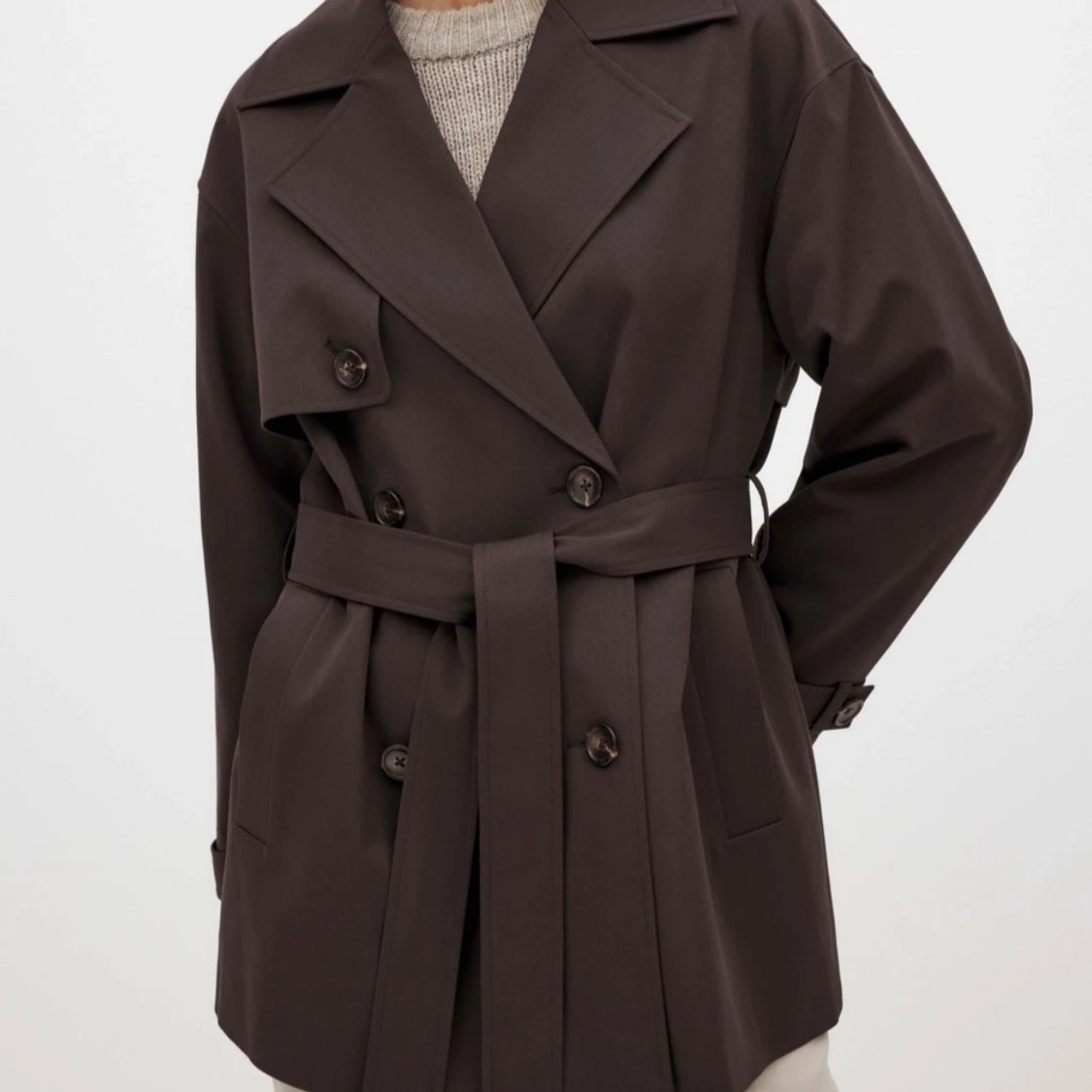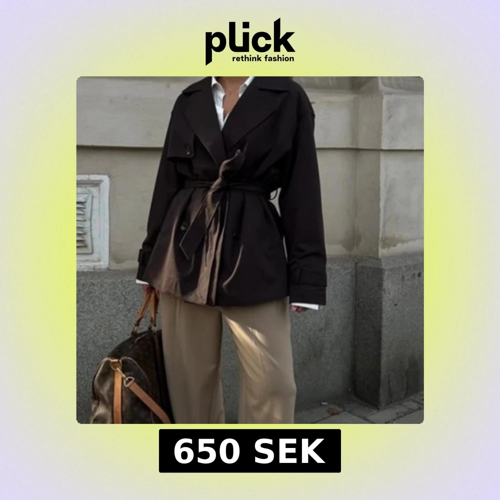 Snygg mörkbrun trenchcoat med klassisk krage, dubbelknäppning och bälte i midjan. Jackan har långa ärmar med spänndetaljer vid handlederna och en stilren, rak passform. Från NAKD, strl 38. Endast använd 1 gång