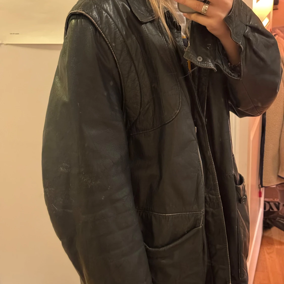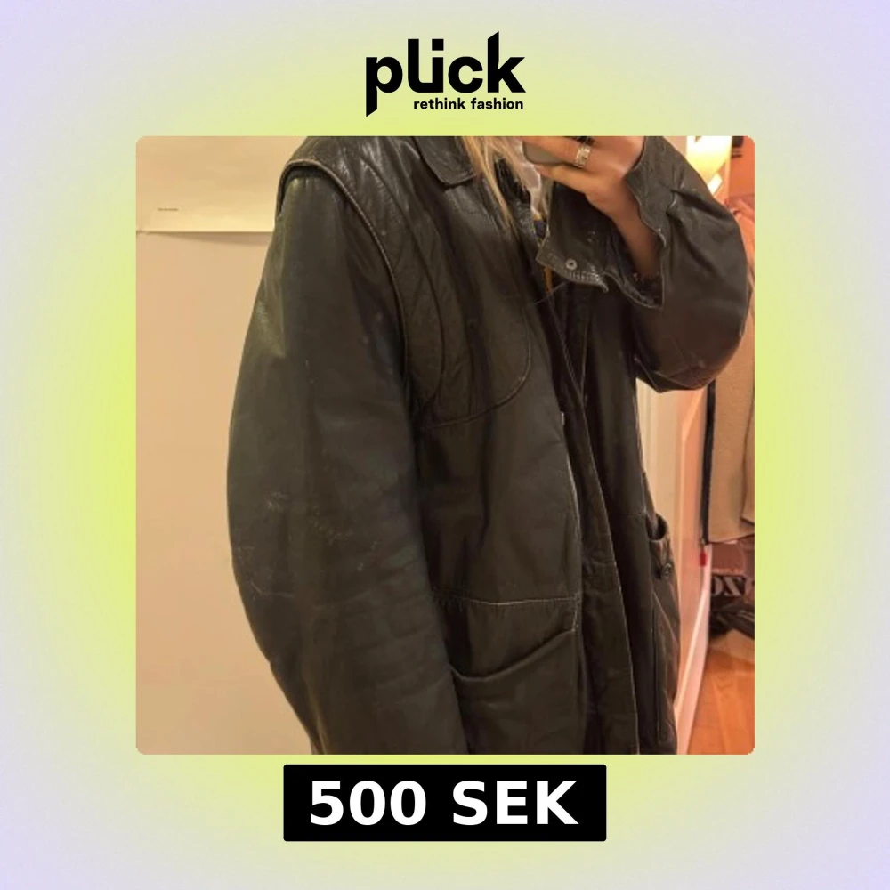 Säljer en stor svart skinnjacka med quiltad insida och knappar framtill. Jackan har stora fickor och en klassisk krage. Perfekt för en cool och avslappnad stil!