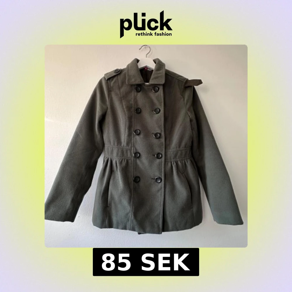 Snygg grön kappa från Divided med dubbelknäppning och axelklaffar. Jackan har en klassisk krage och långa ärmar. Perfekt för höst och vår med sin stilrena design. Ena knappen har lossnat på axelklaffen och kan lätt sys dit igen. Liten i storleken, mer som en storlek 36 än en 38.