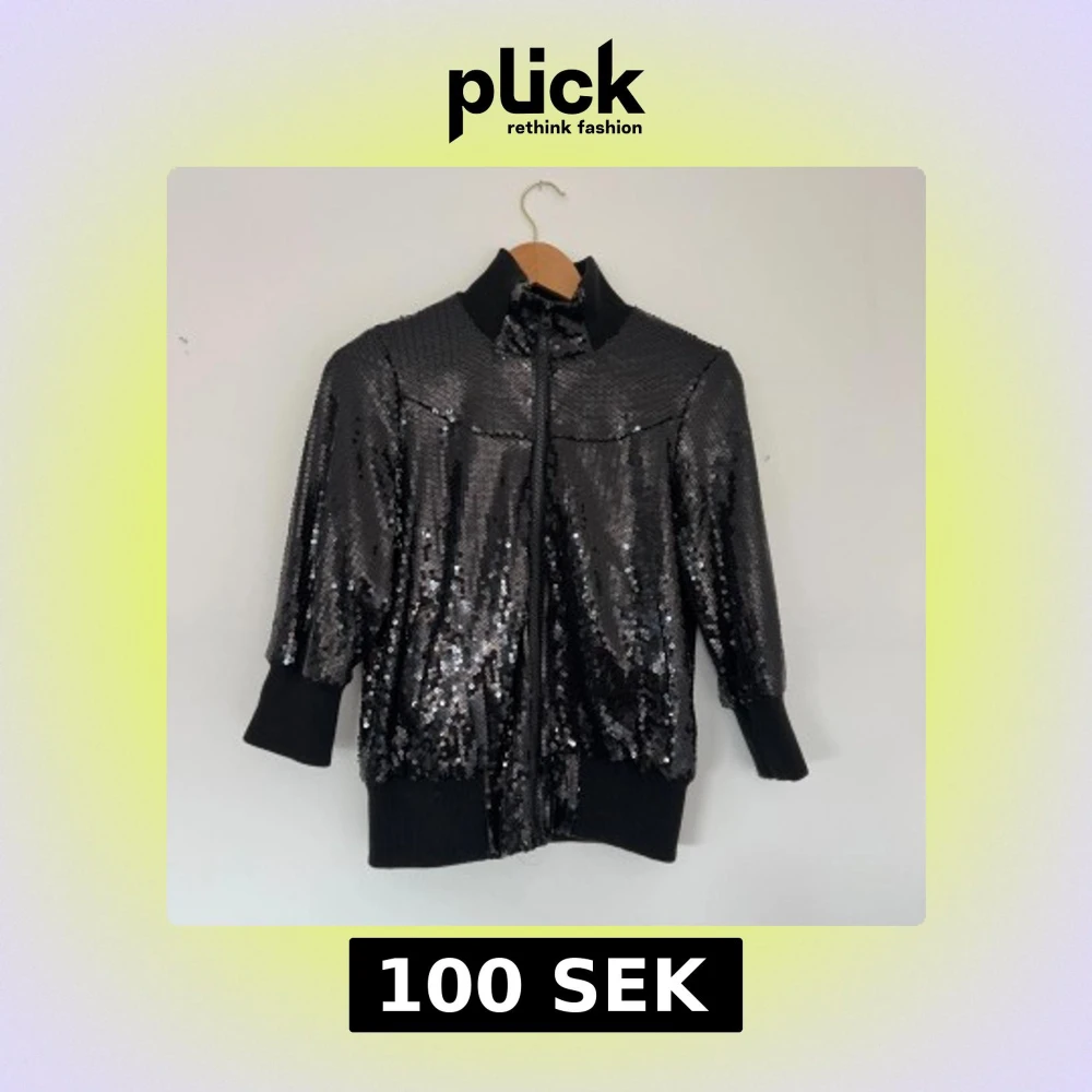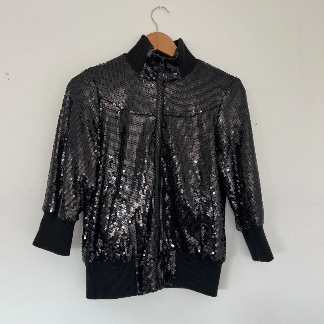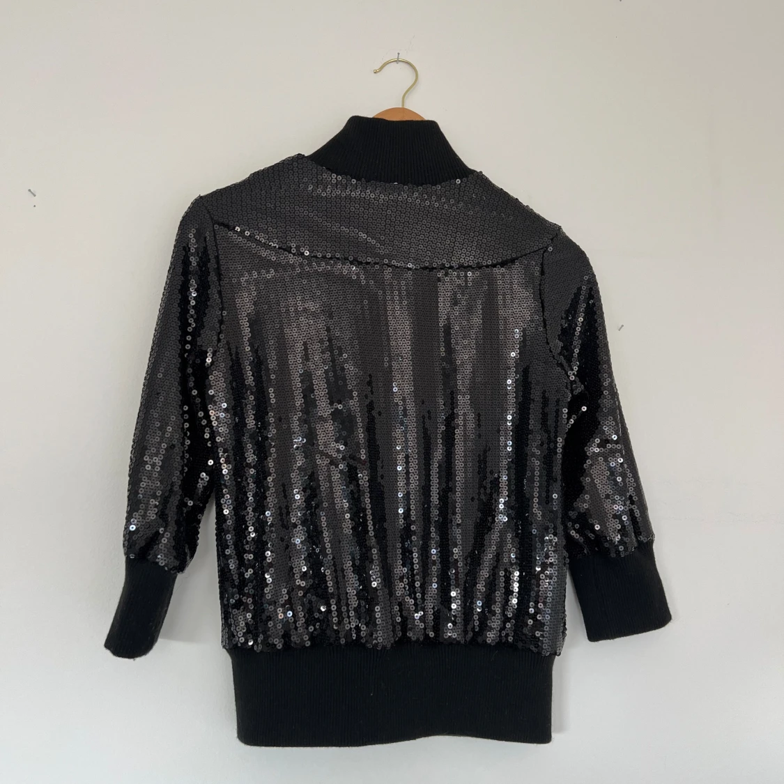 Snygg svart jacka täckt med glittriga paljetter. Jackan har en dragkedja framtill och trekvartsärmar. Perfekt för att sticka ut på festen!