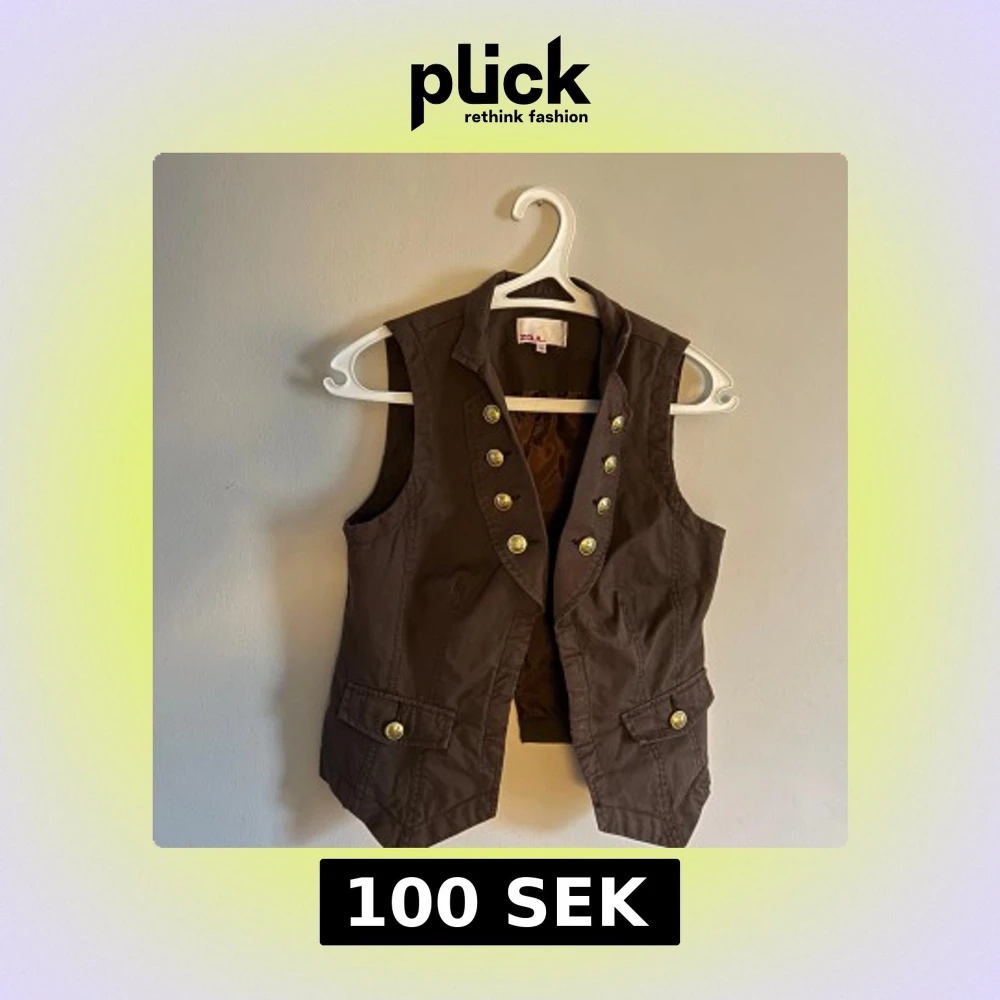 Snygg brun väst med guldknappar och krage. Västen har två fickor framtill med knappdetaljer. Perfekt för att ge en stilfull touch till din outfit. Storleken är mer som en small.