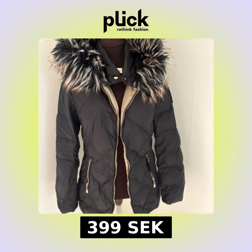 Snygg svart pufferjacka med quiltat mönster och stor fluffig fuskpäls runt huvan. Jackan har dragkedja framtill, två fickor med dragkedjor och coola gulddetaljer. Perfekt för kalla dagar när du vill hålla stilen.