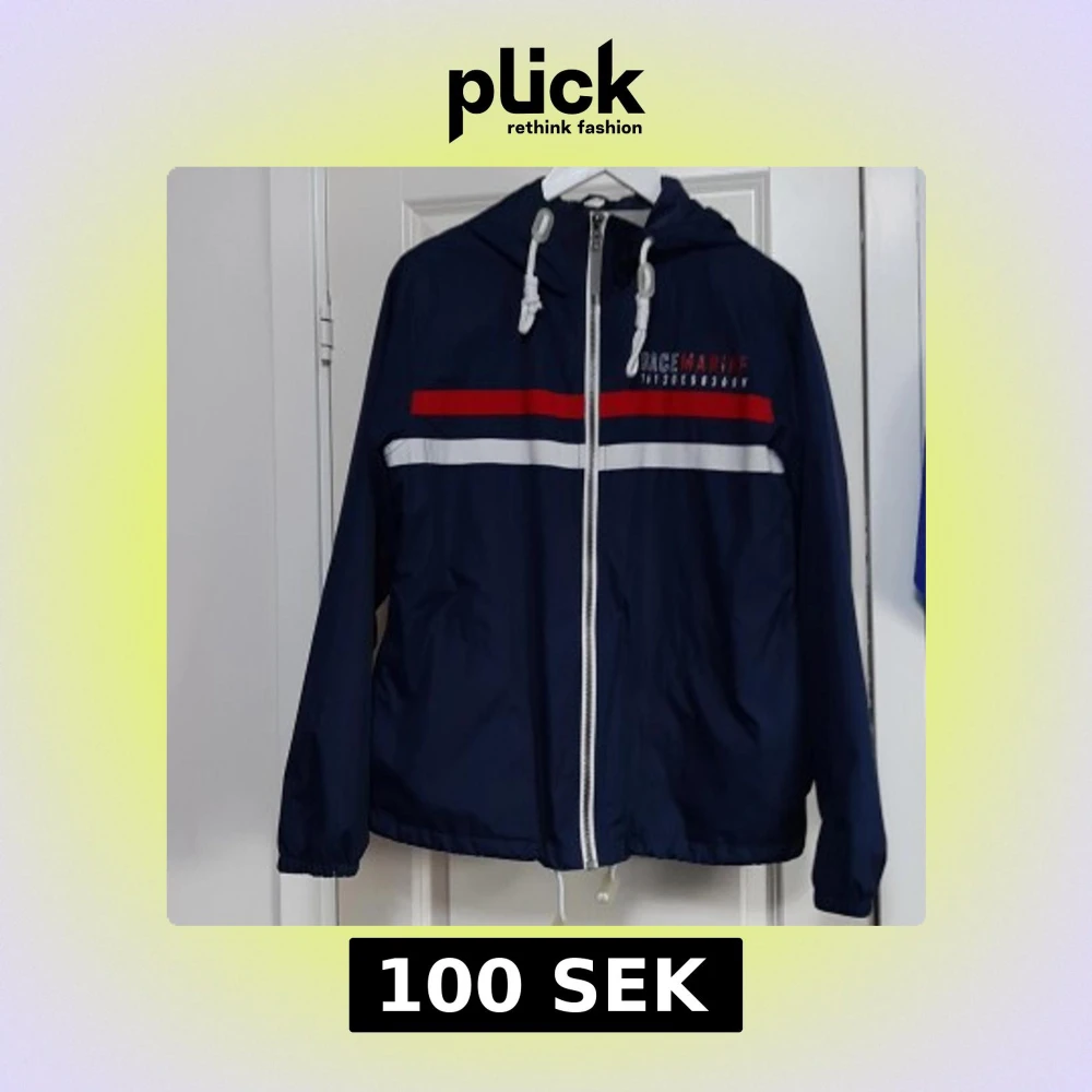 Snygg marinblå vindjacka från Race Marine med huva och vita snören. Jackan har röda och vita ränder över bröstet, hel dragkedja framtill och justerbar nederkant. Perfekt för blåsiga dagar och sportig stil.