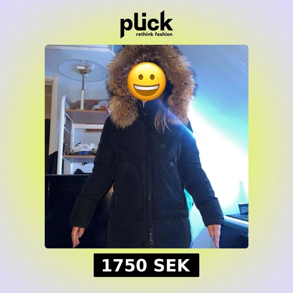Säljer en svart vinterparkas från Chamonix med stor pälskantad huva. Jackan har dragkedja framtill, två stora fickor och är långärmad. Materialet är polyester och dun med tvättbjörnspäls på huvan.