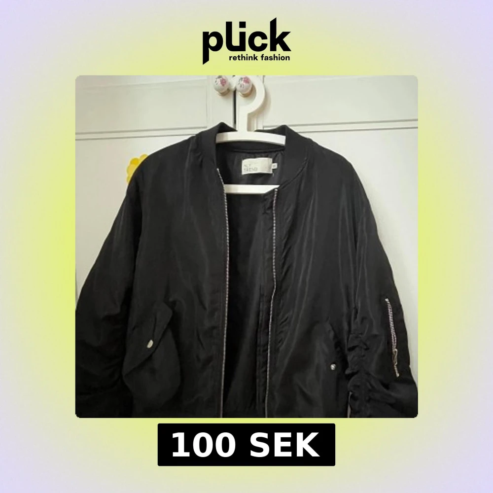 Säljer en svart bomberjacka från NLY Trend med klassisk rund krage och dragkedja framtill. Jackan har fickor med tryckknappar och en ärmficka med dragkedja. Perfekt för en cool och avslappnad stil.