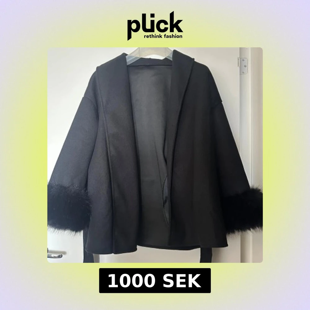 Säljer en svart kappa med bred krage och snygga pälsdetaljer vid ärmsluten. Jackan har ett omlott-utseende och knyts med bälte i midjan. Modellen är loose fit och har långärmade ärmar. Perfekt för dig som vill ha en stilren och trendig look.